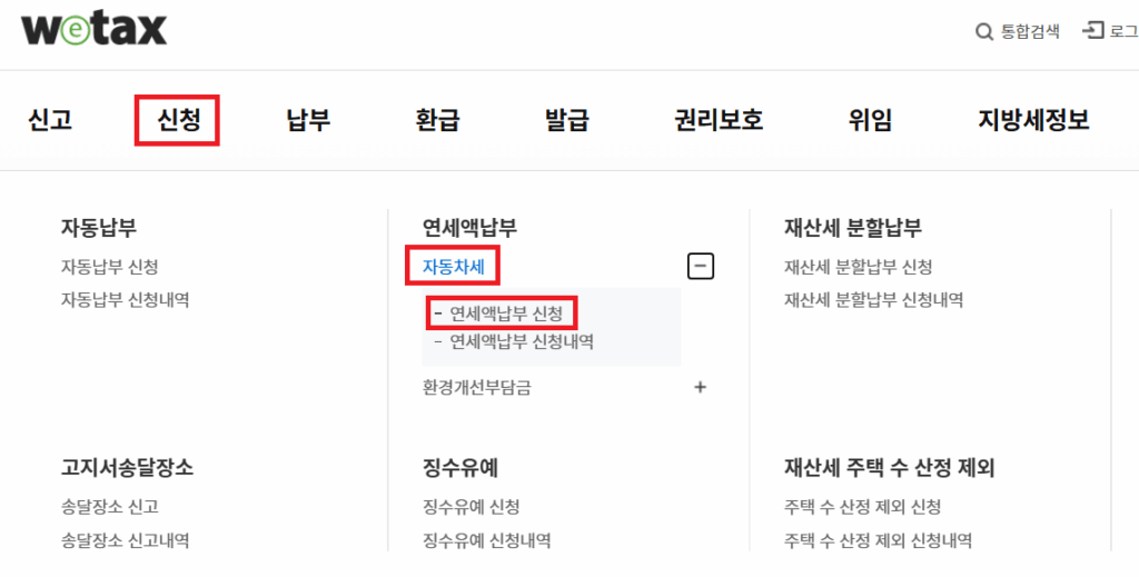 2️⃣ 위택스 홈페이지 상단, 신청 자동차세 연세액납부 신청을 선택합니다.