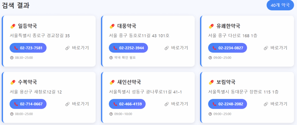 2) 검색 결과에 나온 약국 리스트 중 방문가능한 약국을 확인합니다.